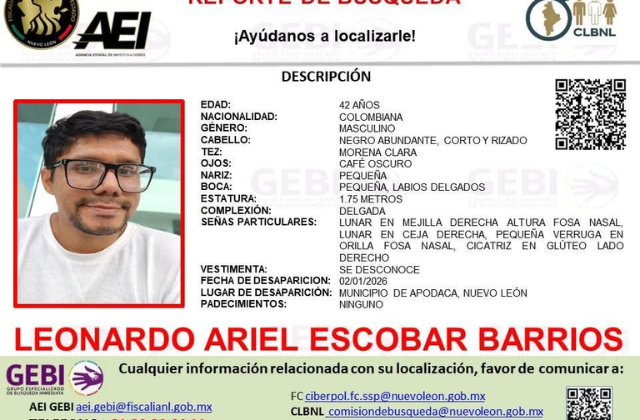 Escobar Barrios fue reportado como desaparecido el pasado 2 de enero, luego de haber sido liberado por la policía de Apodaca tras una presunta falta administrativa cometida en el Aeropuerto Internacional de Monterrey, hecho que marcó el último contacto que tuvieron familiares y colegas.