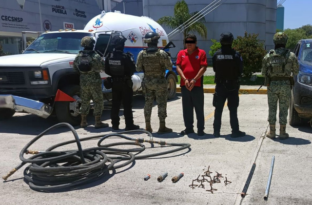🚨 Elementos de @SSPGobPue y Federales detuvieron a un hombre con más de 4 mil litros de gas de procedencia ilícita.