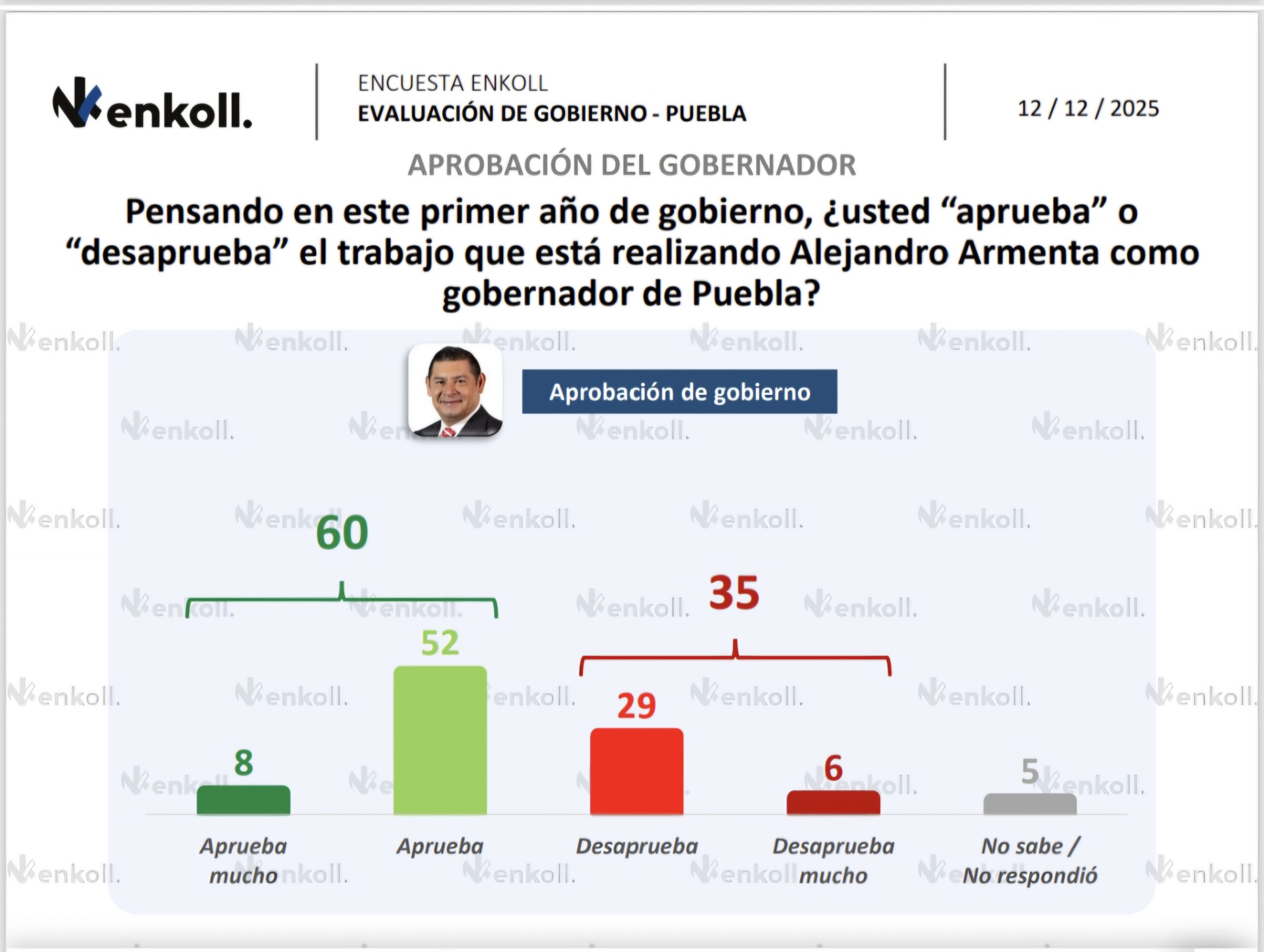 Este estudio de opinión, evaluó el desempeño del mandatario estatal, señalando que su gestión es bien percibida por la mayoría de los poblanos. La desaprobación de su administración se ubica en el 35%, mientras que un 5% no expresó una opinión definida.