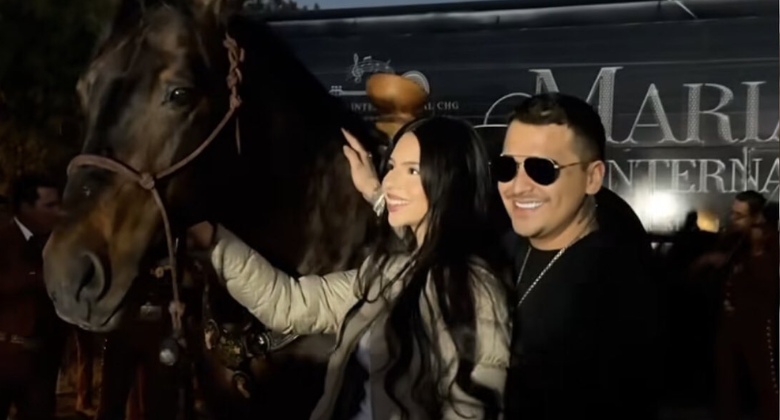 El momento fue registrado en un video difundido en redes sociales, donde se observa a Ángela Aguilar llegar montando un caballo de pelaje oscuro y complexión robusta, acompañado de una montura charra elaborada con detalles artesanales. La reacción de Nodal fue inmediata. Visiblemente sorprendido, se acercó a su esposa, la abrazó y posteriormente montó al animal frente a familiares e invitados cercanos.