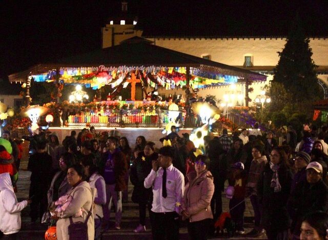 Zacatlán, Pue.- El zócalo de Zacatlán se pintó de ese naranja característico de la flor de cempasúchil, por cada rincón y espacio había eventos, niñas, niños y familias enteras disfrazadas para pedir calaverita y simplemente disfrutar de la Feria de los Muertos 2025.