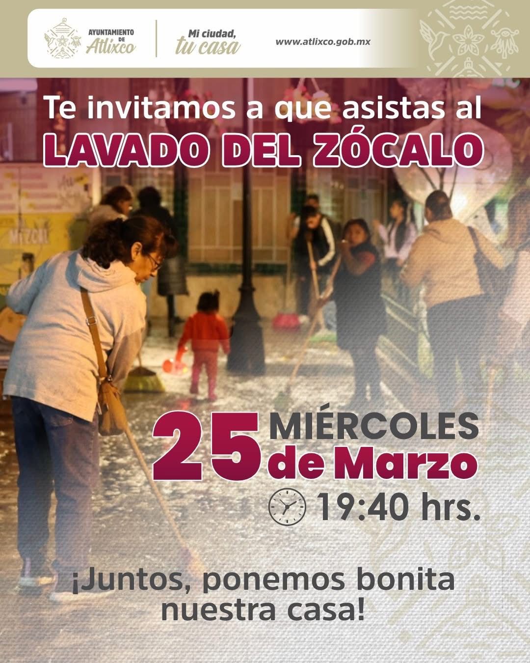 La presidenta de Atlixco, Ariadna Ayala, convoca a la ciudadanía a participar en el lavado del zócalo este miércoles 25 de marzo a las 19:45 horas, junto a vecinos, comerciantes y personal del Ayuntamiento.