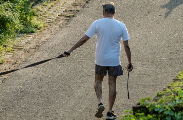 Sin perro, la correa es sujeta por la persona y pretendiendo llevar a su mascota, avanzan sin ningún problema de por medio.