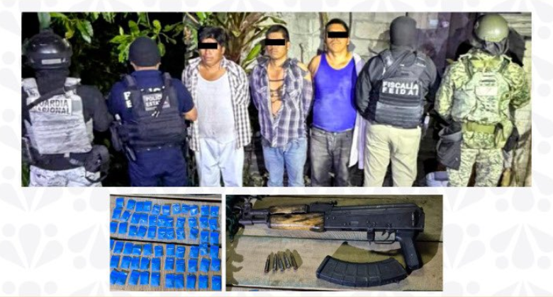 Tras un cateo en Huehuetla, Puebla, fueron asegurados tres de sus integrantes con droga y un arma larga