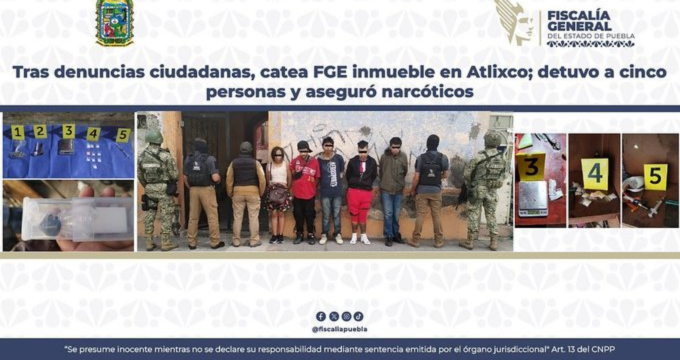 En cumplimiento de una orden girada por el Juez de Control, la Fiscalía General del Estado cateó un inmueble en el municipio de Atlixco, logrando el aseguramiento de múltiples dosis de droga y la detención de cinco personas presuntamente vinculadas con actividades de narcomenudeo.