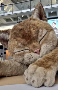 A giant 8-meter ginger cat moves, purrs, and looks almost real. It reacts to “petting” and “feeding” via an interactive screen.