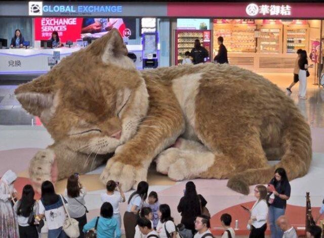 La obra ha generado una fuerte respuesta en redes sociales, donde viajeros comparten fotos y videos del enorme gato descansando en medio del área de llegadas.