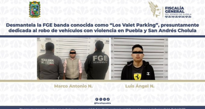 La Fiscalía General del Estado de Puebla logró desmantelar la banda delictiva conocida como “Los Valet Parking”, presuntamente dedicada al robo de vehículos con violencia en los municipios de Puebla y Cholula.