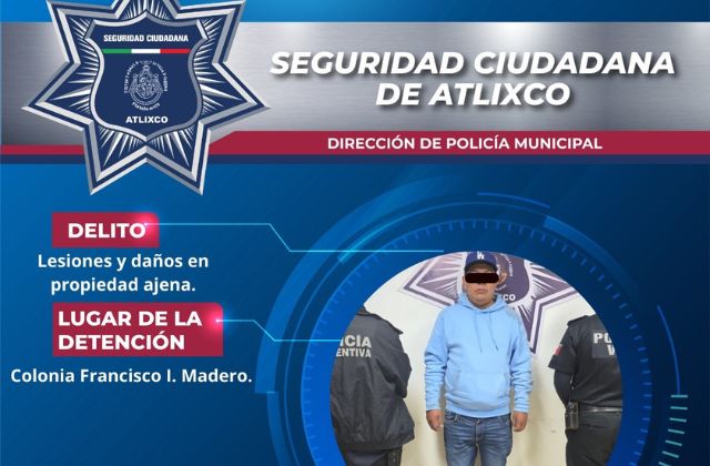 Atlixco, Puebla.– Elementos de la Secretaría de Seguridad Ciudadana (SSC) de Atlixco detuvieron a un hombre por presunta responsabilidad en los delitos de lesiones y daños en propiedad ajena, tras un accidente de tránsito registrado en el municipio.