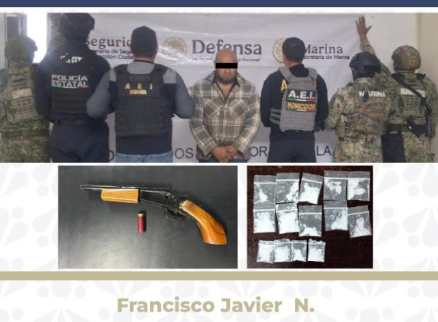 Al marcarle el alto, el sujeto presuntamente realizó disparos de arma de fuego contra los agentes, por lo que, en coordinación con la Secretaría de la Defensa Nacional (DEFENSA), la Secretaría de Marina (SEMAR) y la Secretaría de Seguridad Pública Estatal (SSPE), se logró su detención. Asimismo, entre sus pertenencias fueron localizados un arma de fuego y diversos envoltorios con la droga conocida como cristal.