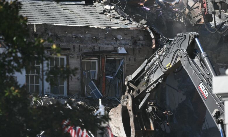 Excavadoras se afanan en derribar parte de las paredes y del tejado de la residencia oficial.