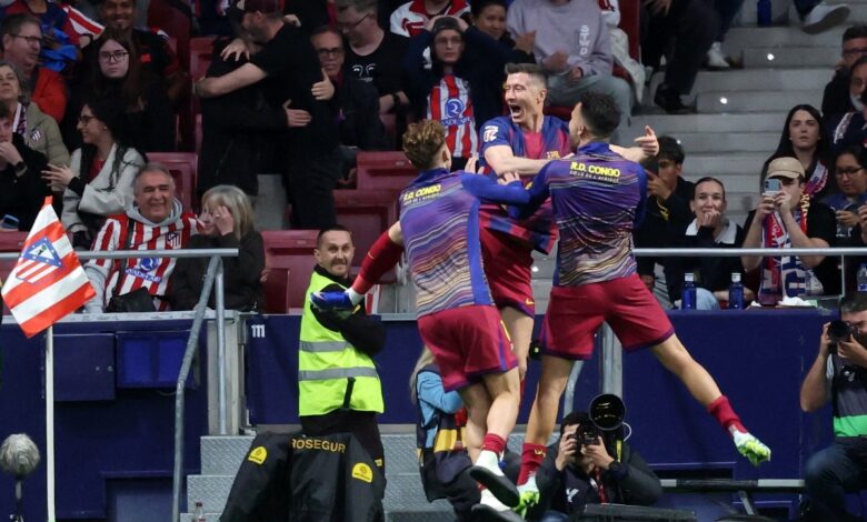 Robert Lewandowski marcó de cabeza el gol de la victoria en los últimos minutos para el Barcelona, que se impuso al Atlético de Madrid por 2-1 el sábado, ampliando su ventaja a siete puntos en la cima de La Liga tras el tropiezo del Real Madrid.