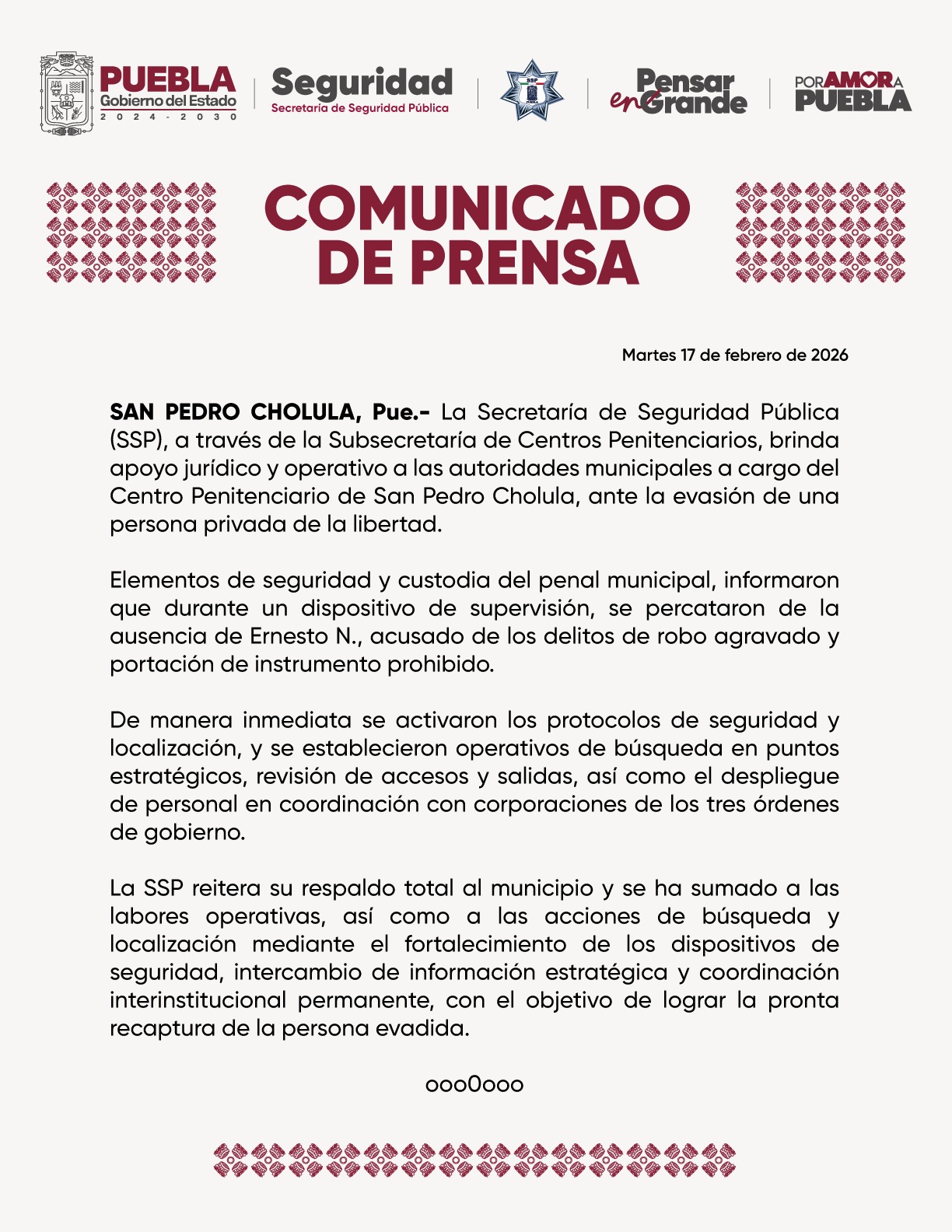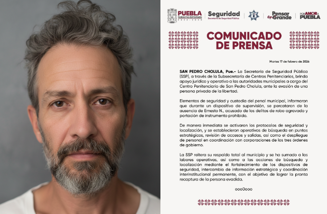 Durante la madrugada, la SSP informó en un comunicado sobre la fuga de este interno del Centro Penitenciario de San Pedro Cholula y reitera su respaldo total al municipio y se ha sumado a las labores operativas, así como a las acciones de búsqueda y localización mediante el fortalecimiento de los dispositivos de seguridad, intercambio de información estratégica con el objetivo de lograr la pronta recaptura de la persona evadida.
