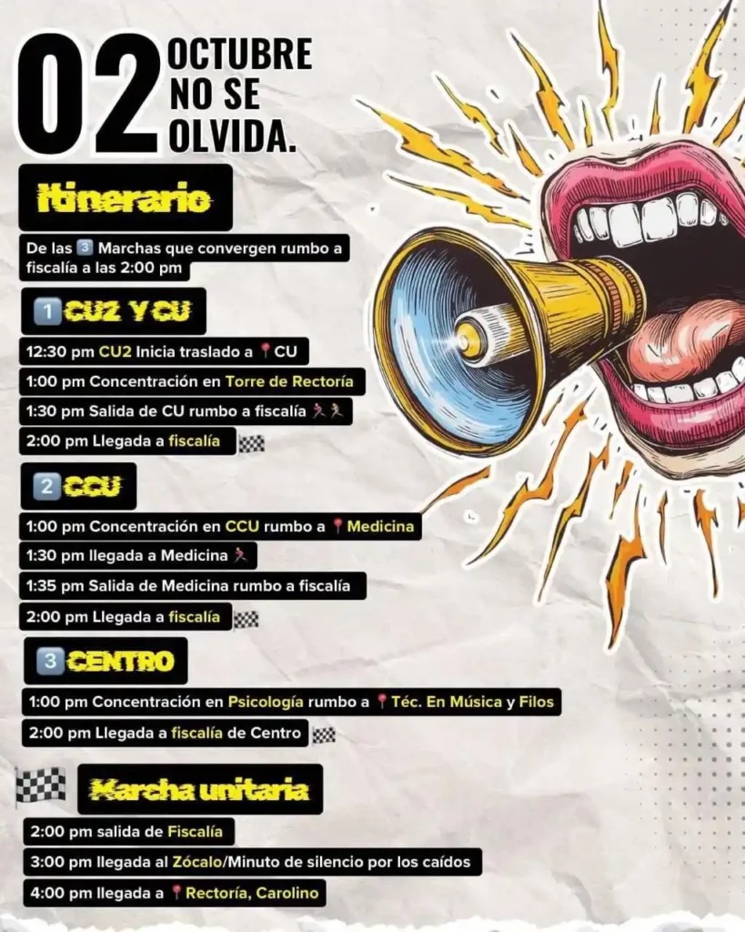 Como cada año, diversas organizaciones estudiantiles y civiles han convocado a marchas conmemorativas para recordar el 2 de octubre bajo el lema “No se Olvida”. Las movilizaciones se desarrollarán este día en Puebla y en Tribuna Noticias te contamos el recorrido.