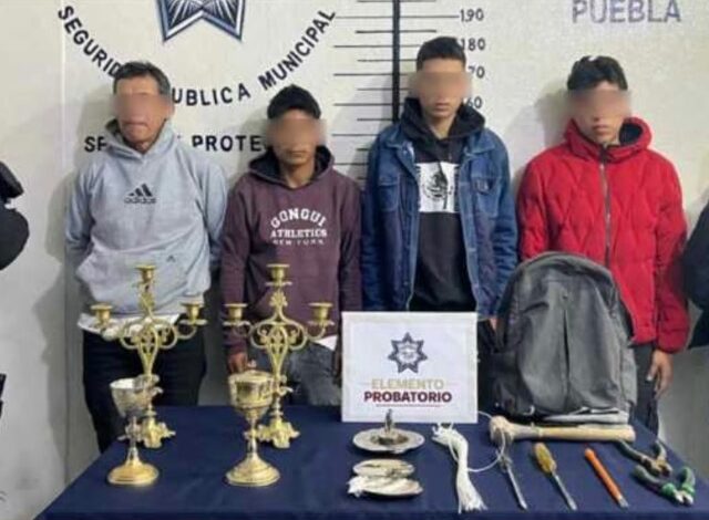 San Pedro Cholula, Pue. — Como resultado de la pronta y efectiva respuesta de elementos de la Secretaría de Seguridad Ciudadana de San Pedro Cholula (SSC Cholula), se logró frustrar el robo de piezas de arte sacro en la iglesia de San Juan Calvario, ubicada en el barrio del mismo nombre, además de la detención de cuatro probables responsables.