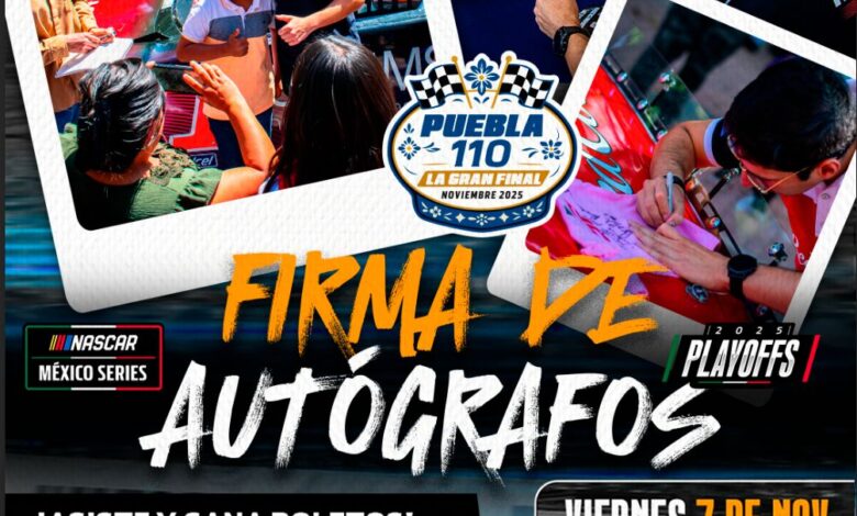 Para promover la convivencia familiar y eventos de primer nivel entre las y los poblanos, el Gobierno de la Ciudad que encabeza el alcalde Pepe Chedraui Budib, invita a la firma de autógrafos de una veintena de pilotos y exhibición de autos de NASCAR México Series, el próximo viernes 7 de noviembre, a las 17:00 horas, en el estacionamiento del Parque Juárez.