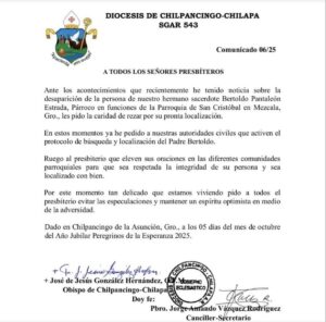 La Diócesis de Chilpancingo-Chilapa había informado la desaparición del sacerdote la mañana del lunes y pidió a las comunidades elevar oraciones por su pronta localización. El obispo José de Jesús González Hernández exhortó a evitar especulaciones y mantener la esperanza, además de solicitar a las autoridades civiles activar los protocolos de búsqueda.