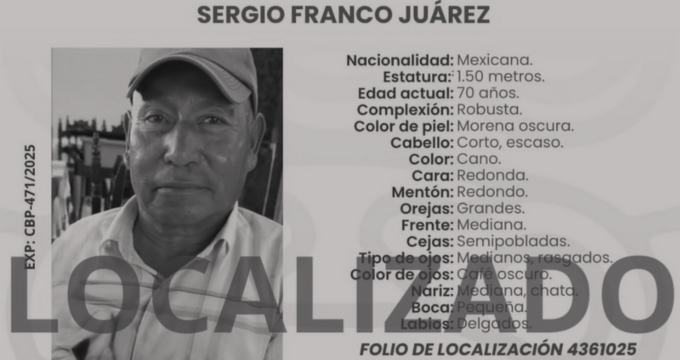 El Gobierno del Estado de Puebla, a través de la Secretaría de Gobernación y la Comisión de Búsqueda de Personas del Estado de Puebla, encabezada por Juan Enrique Rivera Reyes, informa sobre la localización sin vida de Sergio Franco Juárez, originario de la localidad de Papatlazolco, municipio de Huauchinango.