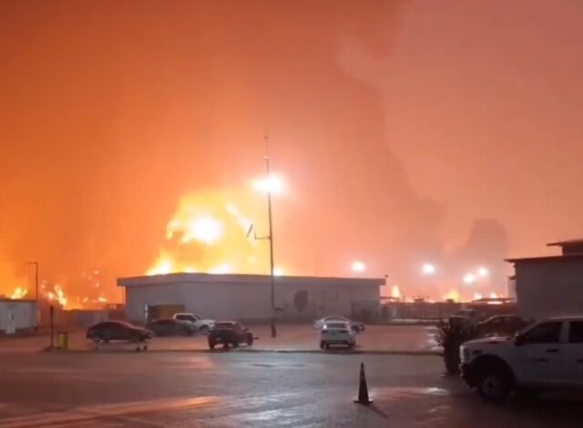 En redes sociales circularon videos donde se observa las instalaciones petroleras, ubicadas justo en la costa del Golfo de México, devoradas por el fuego en medio de una intensa lluvia.