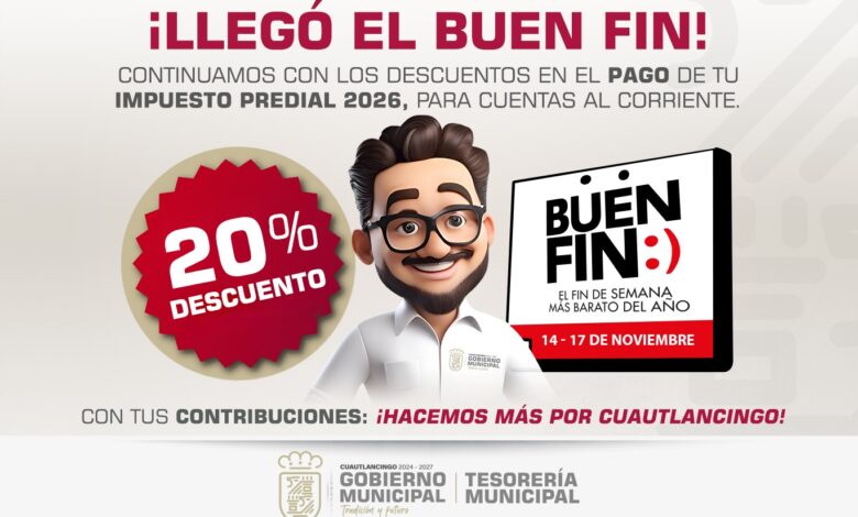 Durante el Buen Fin del 14 al 17 de noviembre, se aplicará un 20% de descuento en el pago del predial 2026 a personas al corriente y un 100% en multas y recargos a las morosas que deben antes del 2025.