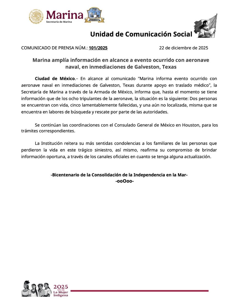 La SEMAR informó que mantiene una comunicación estrecha y constante con el Consulado General de México en Houston para gestionar los trámites legales y diplomáticos correspondientes, así como para brindar apoyo a los afectados y sus familias.