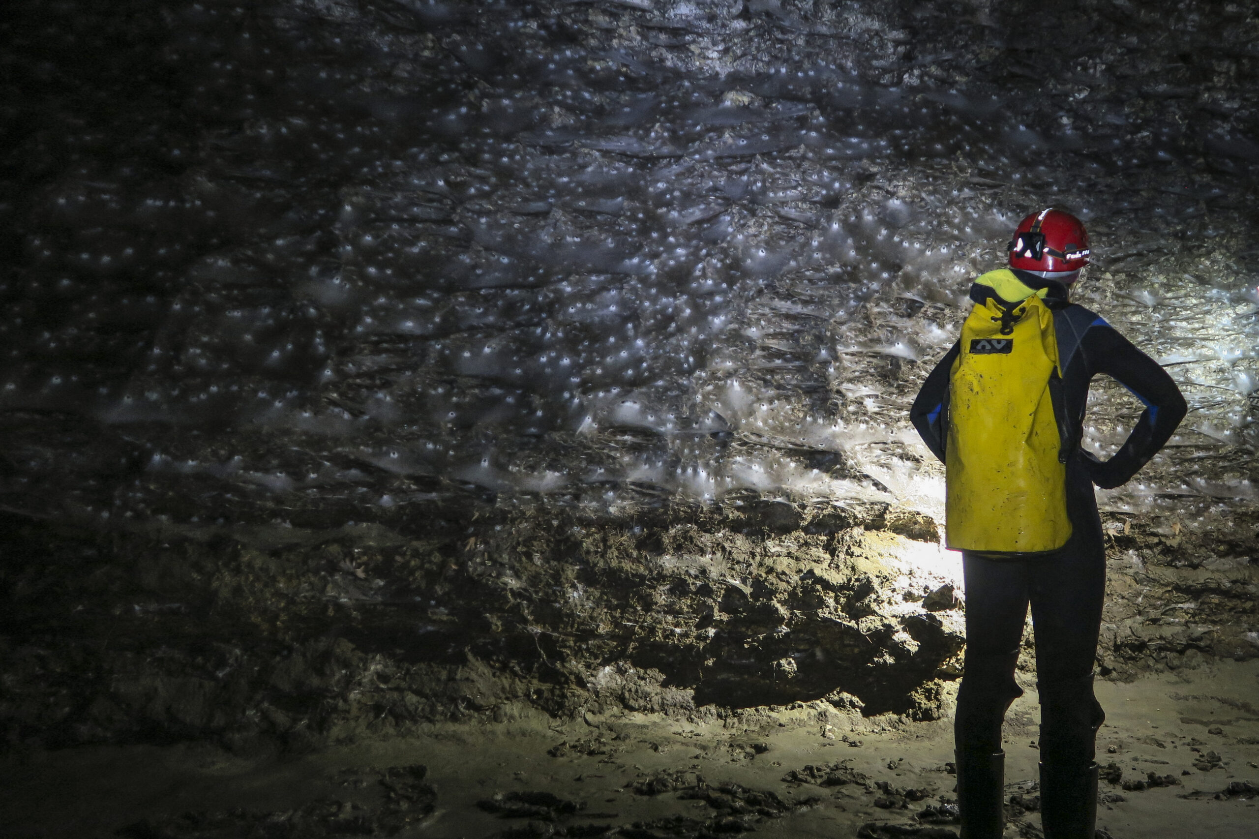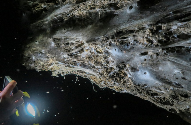 Imágenes recibidas el miércoles por la AFP muestran partes de la inmensa red colgando de la pared como una pesada cortina de terciopelo negro bajo la mirada de fascinación de un científico equipado como un espeleólogo.