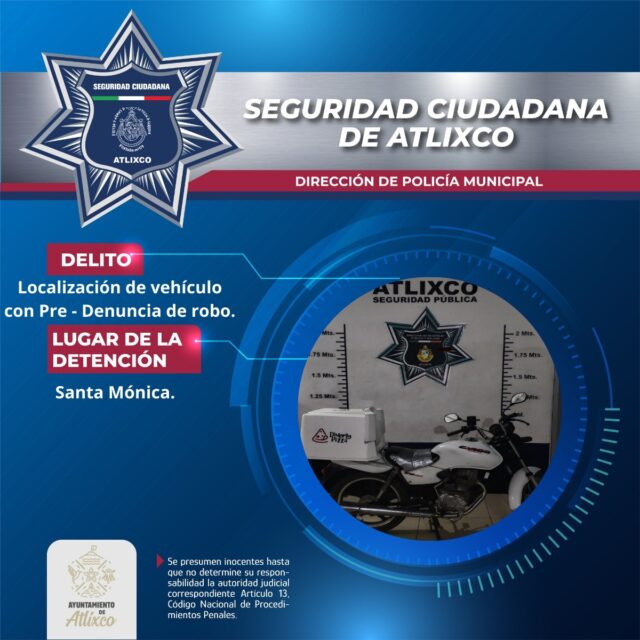 Localiza la SSC de Atlixco motocicleta con reporte de robo Puebla, Puebla.— Durante un patrullaje de rutina, elementos de la Secretaría de Seguridad Ciudadana de Atlixco localizaron una motocicleta con reporte de robo vigente en calles del municipio. La unidad fue ubicada sobre la calle Magnolias, en la colonia Santa Mónica, sin personas a bordo. Se trata de una motocicleta Honda, color blanco, que portaba … | |