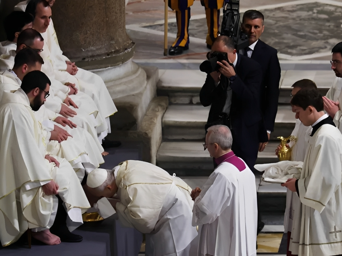 Realiza papa León XIV lavatorio de pies a 12 sacerdotes en Roma El papa León XIV realizó por primera vez el ritual del lavatorio de pies en Jueves Santo, marcando un retorno a la tradición clásica de este rito, a diferencia de su predecesor, Francisco, quien solía celebrarlo con personas sin hogar, presos y otros grupos marginados. El pontífice, de 70 años, preside por primera vez las … | |