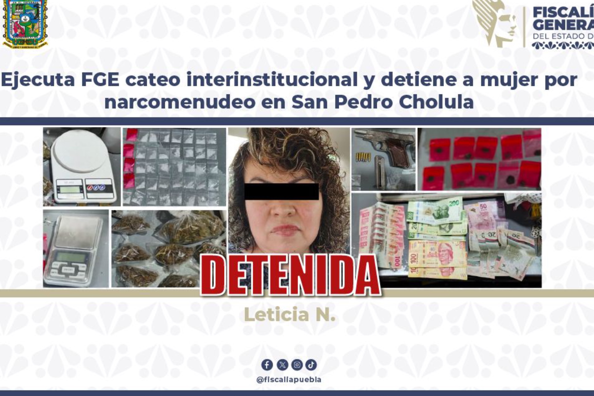 Detienen a mujer por presunta venta de droga en San Pedro Cholula Autoridades estatales y federales realizaron un cateo en San Pedro Cholula que derivó en la detención de una mujer señalada por delitos contra la salud. La Fiscalía General del Estado de Puebla informó que, tras trabajos de inteligencia realizados el 16 de abril de 2026, se ubicó un inmueble con apariencia de negocio que presuntamente … | |
