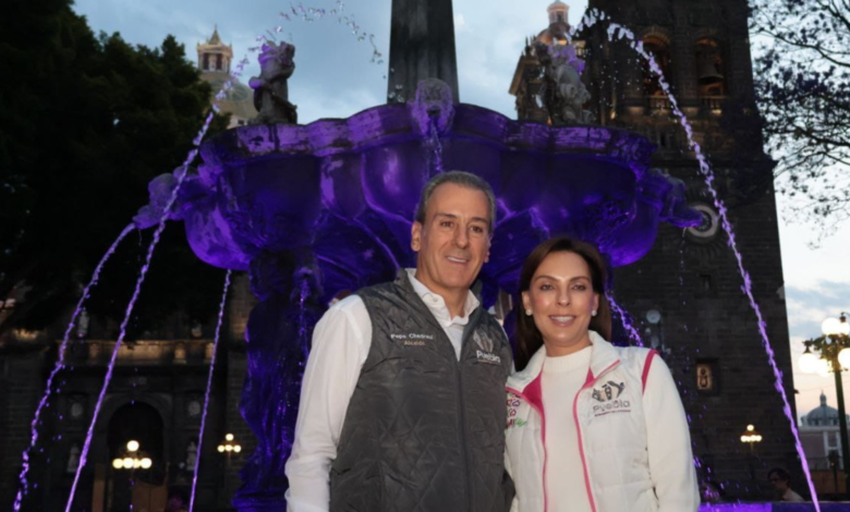 Puebla, Pue., 20 de marzo de 2026.- Desde la emblemática Fuente de San Miguel, ubicada en el zócalo de Puebla, el presidente municipal, Pepe Chedraui, junto con la presidenta del Patronato del DIF Puebla Capital, MariElise Budib, impulsó la iniciativa Mujeres que Brillan con la iluminación simbólica de color violeta de las fuentes en la ciudad, como una iniciativa orientada a fortalecer la visibilización de la lucha feminista por la igualdad de género y a refrendar el compromiso institucional para erradicar la violencia y la desigualdad contra las mujeres.