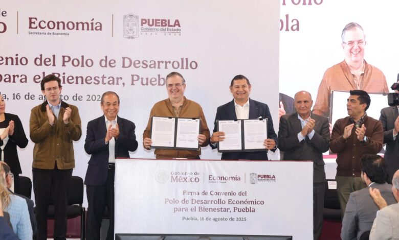 SAN JOSÉ CHIAPA, Pue.- El secretario de Economía del Gobierno de México, Marcelo Ebrard y el gobernador de Puebla, Alejandro Armenta, encabezaron la firma de Convenio del Polo de Desarrollo Económico para el Bienestar “Capital de la Tecnología y la Sostenibilidad”, a través del cual se incentivará la inversión y se protegerá a empresarios locales y nacionales, como lo establece la política del gobierno de la presidenta Claudia Sheinbaum.
