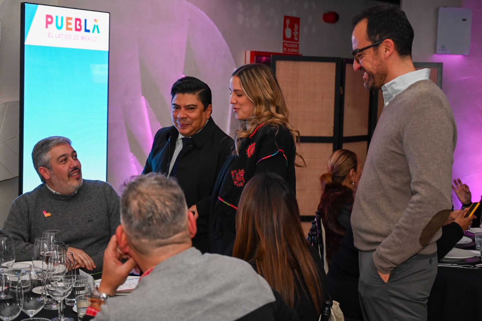 Durante la bienvenida, la secretaria presentó a la comitiva del estado y a los anfitriones, a quienes acudieron como representantes del talento culinario, productivo y artesanal de Puebla. Participaron: Ángel Vázquez, chef poblano del restaurante Augurio; Victoria Serrano, cocinera tradicional de Cholula y empresaria de Mole Xalóztoc; Raúl Persino Díaz, maestro mezcalero y creador de la marca Mezcal Arráncame la Vida; Román Valderrábano, caficultor de Xicotepec y fundador de Café El Catador; Acitlali Azucena Ávila Francisco, artesana especializada en bordados de Cuetzalan e integrante del proyecto Yolkuali; y Consuelo Díaz, artesana y especialista en pintura en Talavera Uriarte.