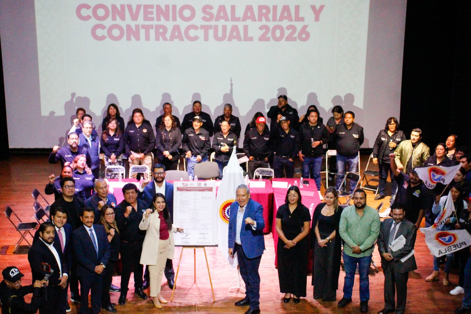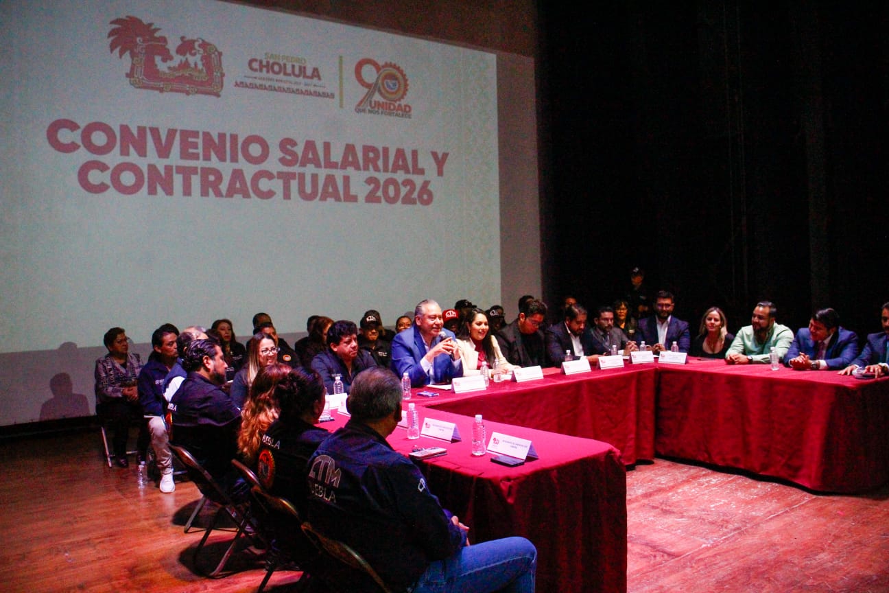 9 de abril de 2026, San Pedro Cholula, Pue.– La presidenta municipal Tonantzin Fernández y el secretario general de la CTM Puebla, Leobardo Soto, dieron a conocer el Convenio Salarial y Contractual 2026 para las y los trabajadores del sindicato “Luis Cabrera”, el cual contempla un aumento salarial directo de 4.5% y un incremento total de 15.4% al incluir prestaciones.