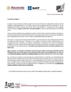Este martes 14 de octubre, trabajadores del Servicio de Administración Tributaria (SAT) en todo el país iniciaron un paro nacional bajo la modalidad de “brazos caídos”, en protesta por la falta de cumplimiento en el ajuste salarial correspondiente al presente año.
